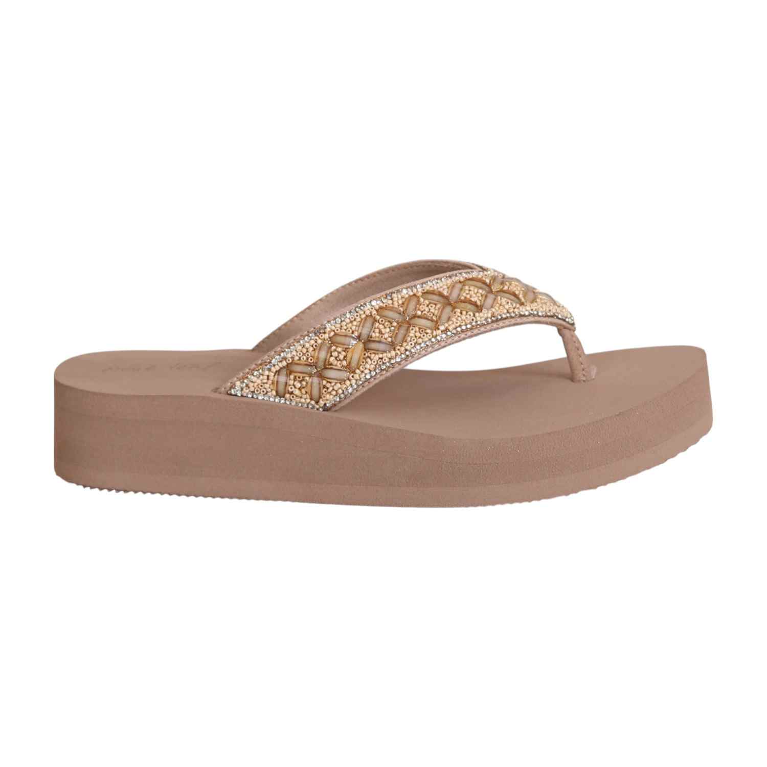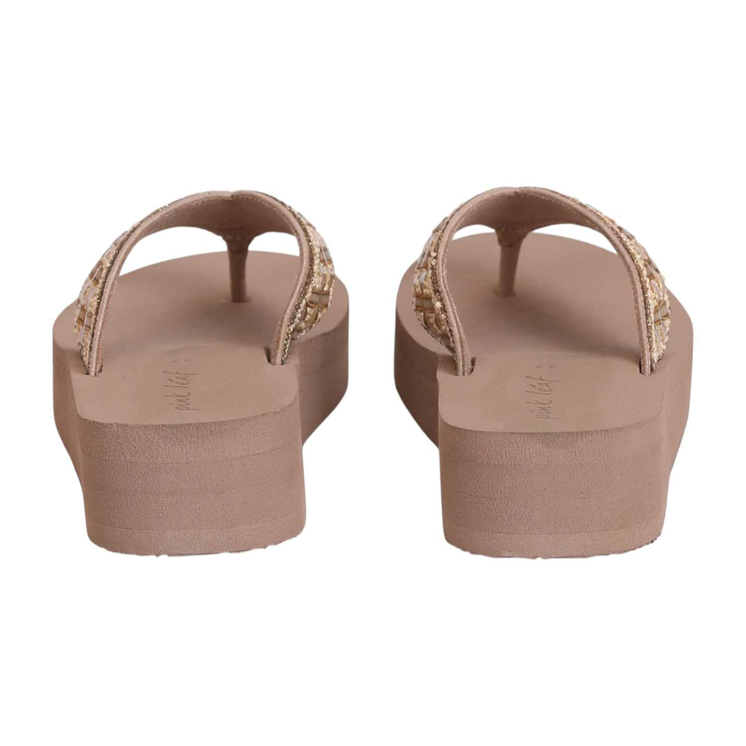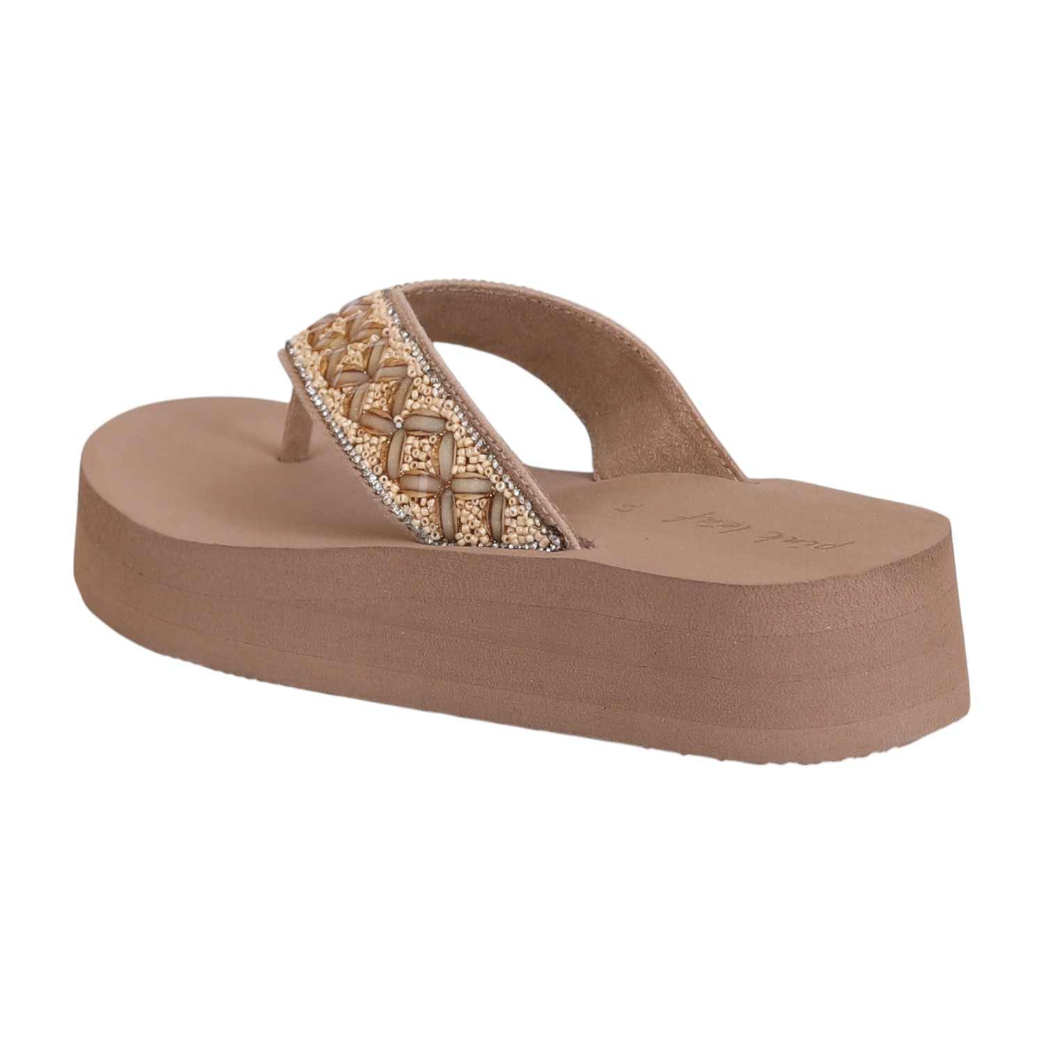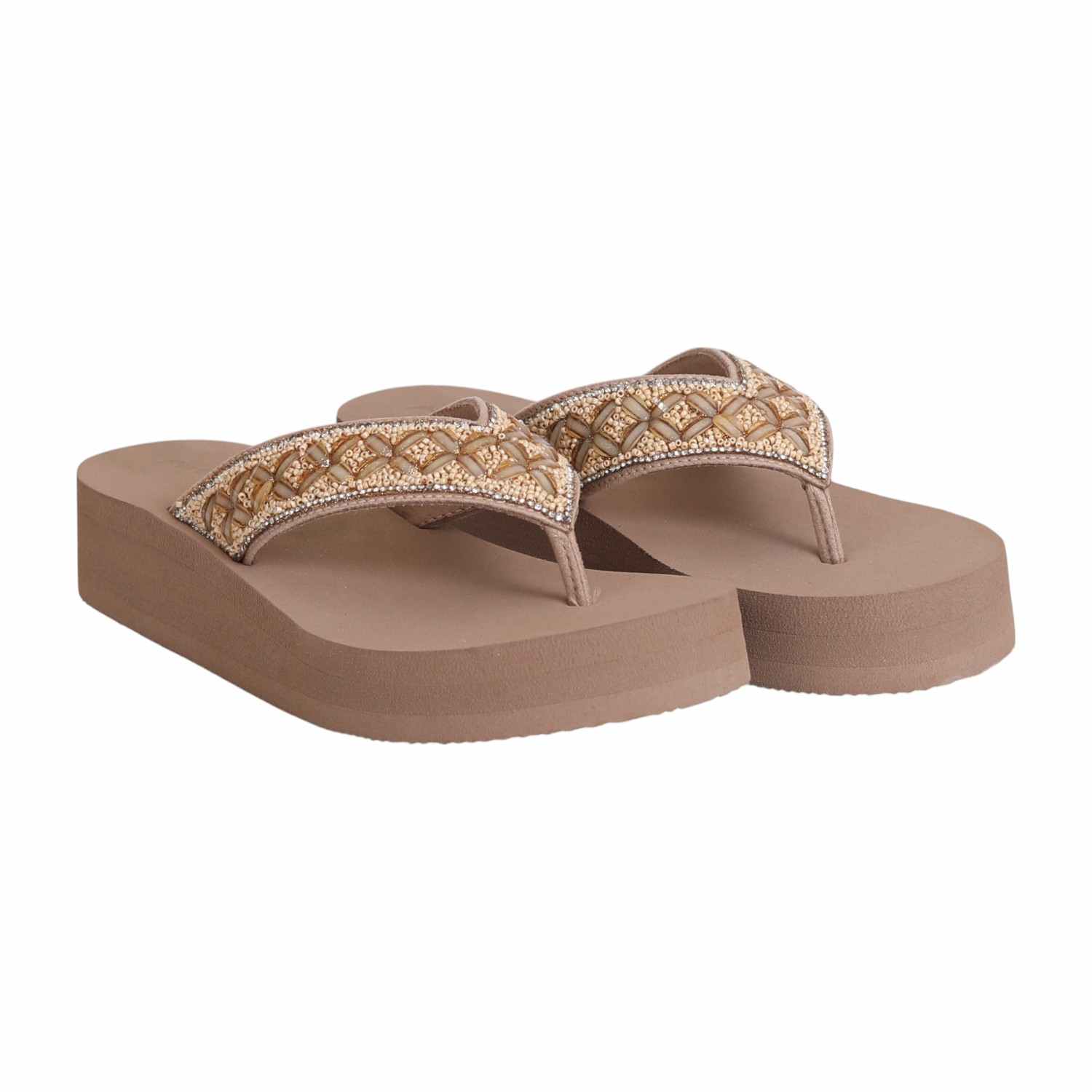 Inspired by desert elegance, these platform sandals feature a beautifully woven strap adorned with intricate beadwork that adds a soft shimmer to every step. The warm neutral tones and cushioned sole create a blend of earthy charm and all-day comfort—perfect for breezy days, casual outings, or a touch of sparkle in your everyday look.