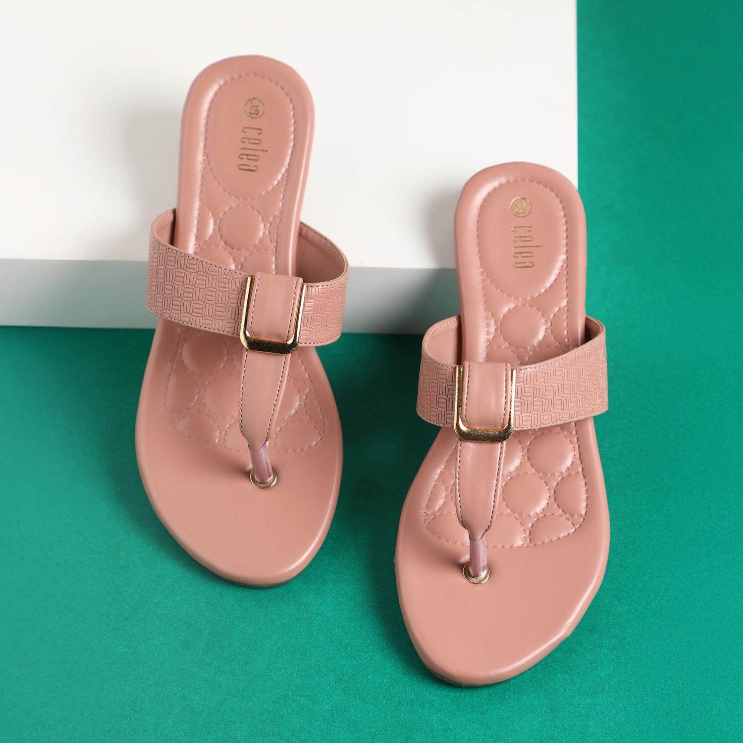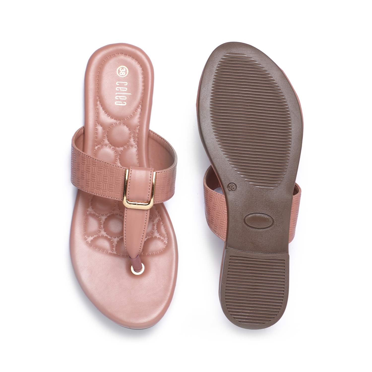 Step into comfort and elegance with Celea's stylish Peach Casual flats. Designed with a cushioned footbed and a sturdy sole, these sandals provide all-day support. The broad strap with a chic gold-tone buckle adds a touch of Grace, making them perfect for casual and semi-formal occasions. Stay fashionable and comfortable with Celea!
