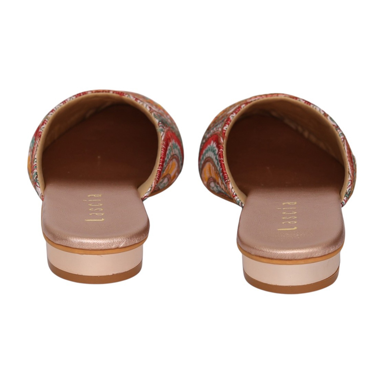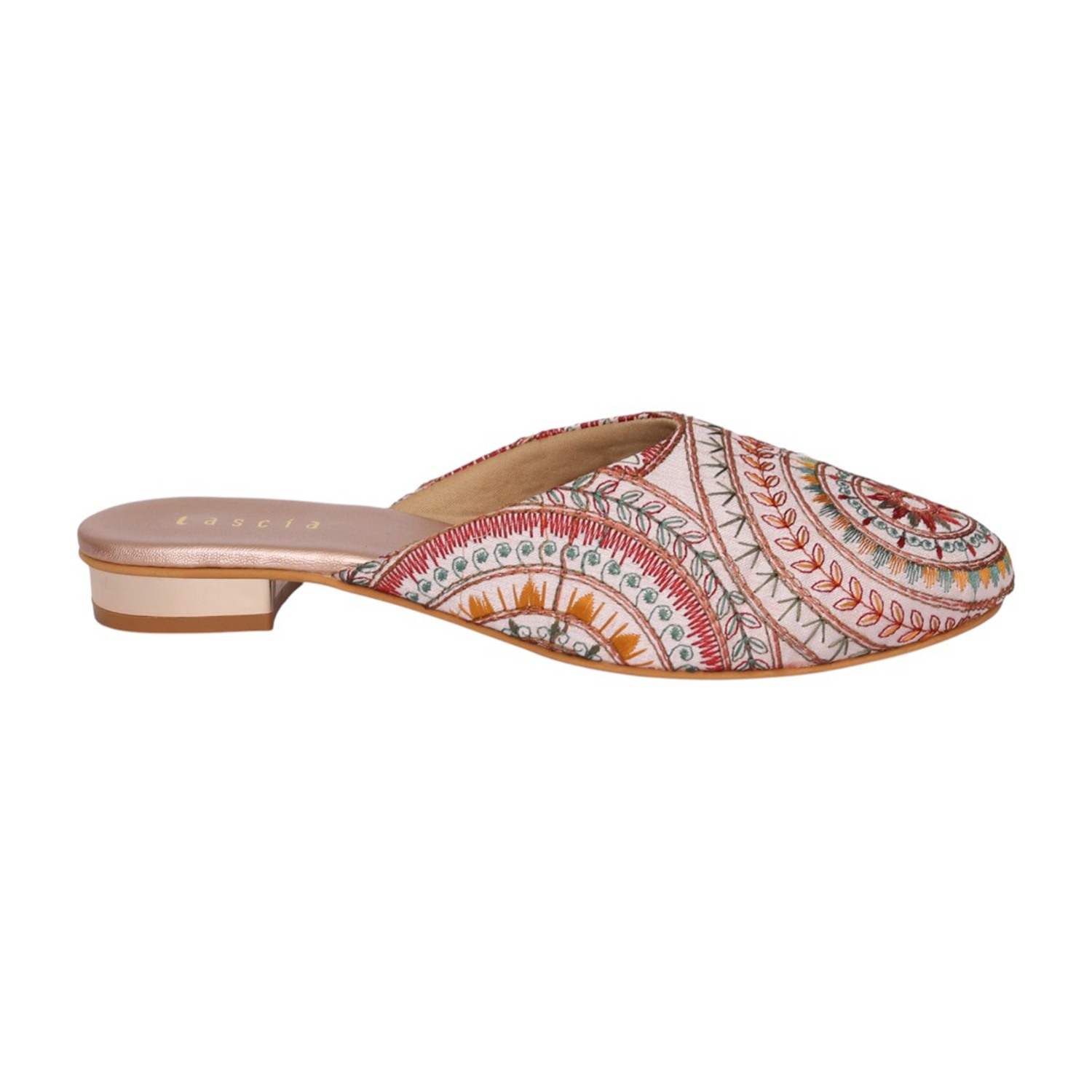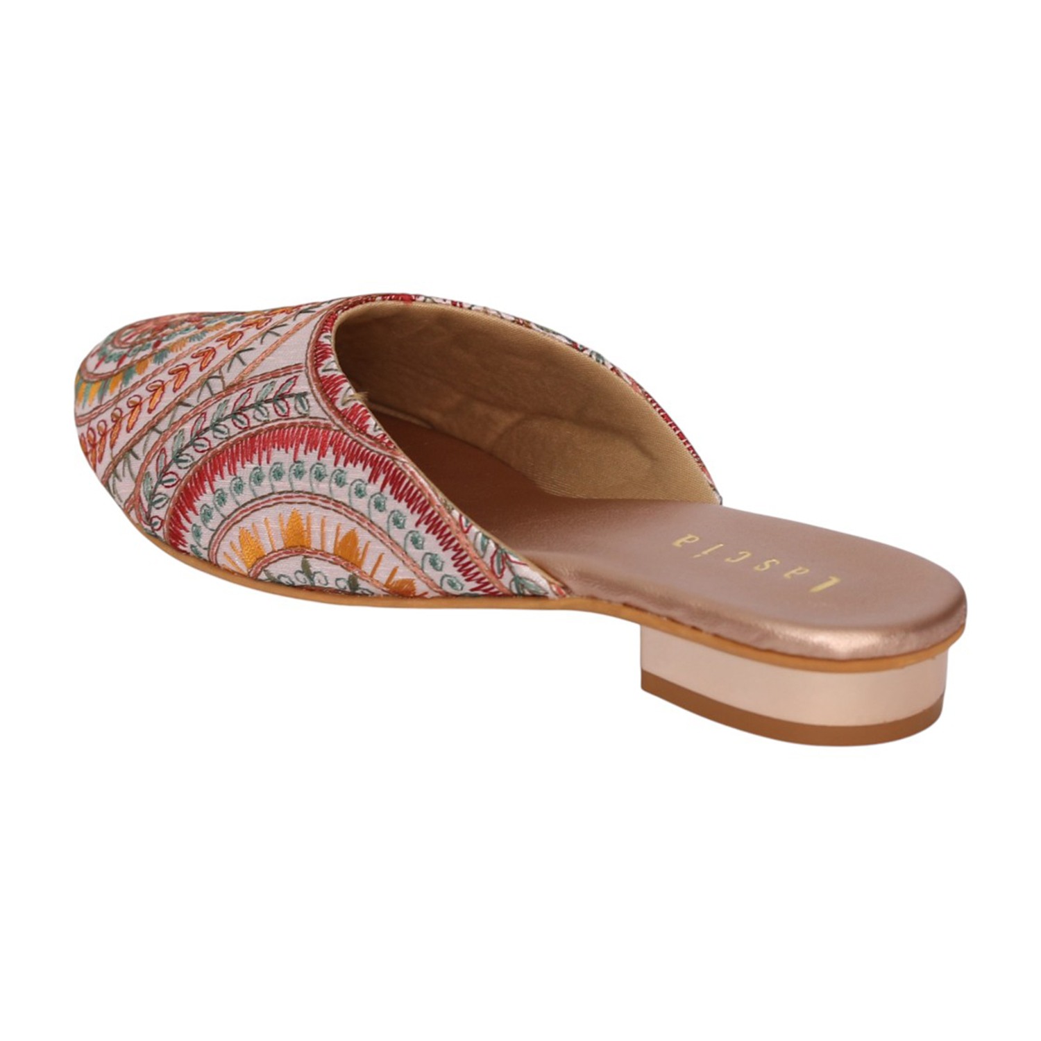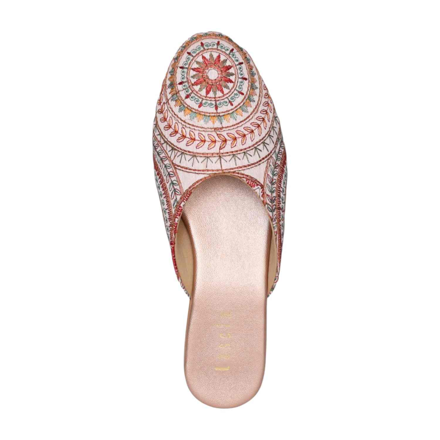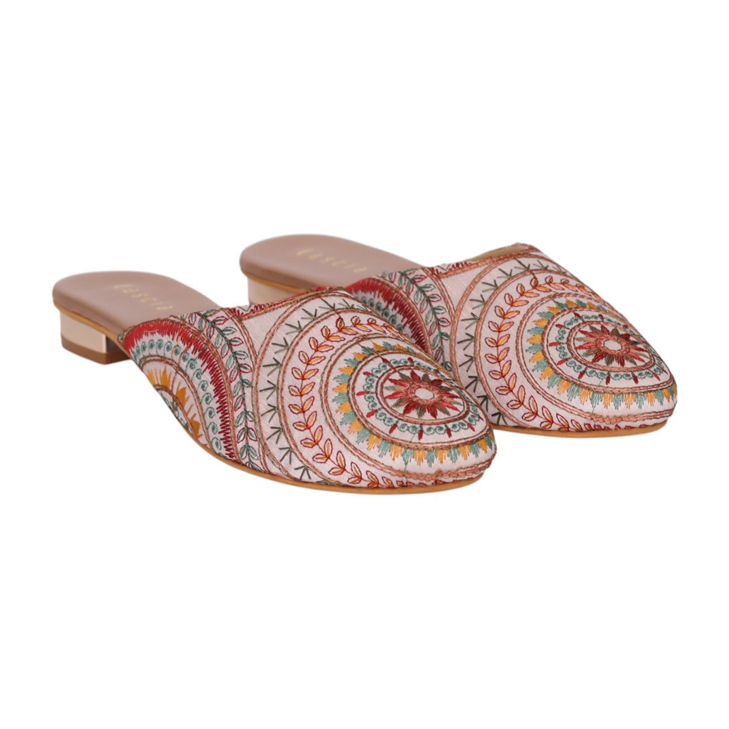 Add a touch of artisanal charm to your footwear collection with these elegant sultan mule heels. Designed with intricate multicolor embroidery in a striking circular and geometric pattern, these slip-ons bring a perfect blend of tradition and contemporary style. The pointed toe silhouette enhances the overall look, while the low block heel offers comfortable elevation for all-day wear. Crafted for both style and ease, these mules feature a cushioned footbed and an open-back design for effortless wearability. Ideal for festive occasions, casual outings, or fusion wear styling, these statement mules are a must-have for a chic wardrobe.