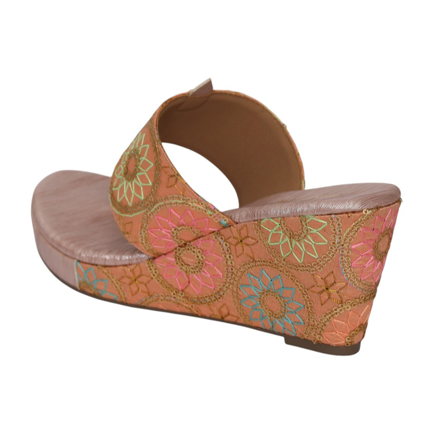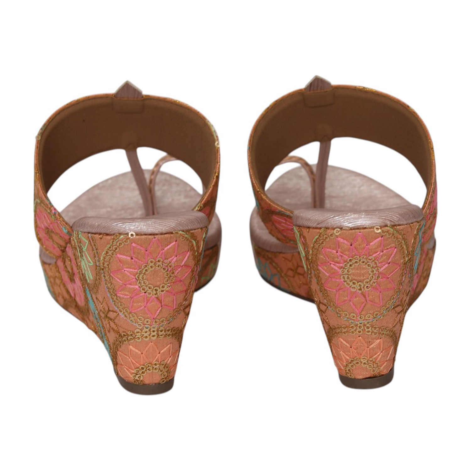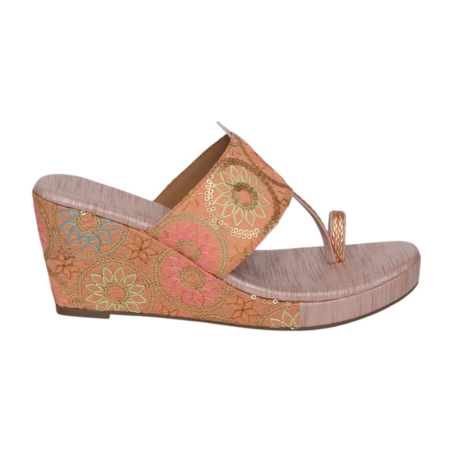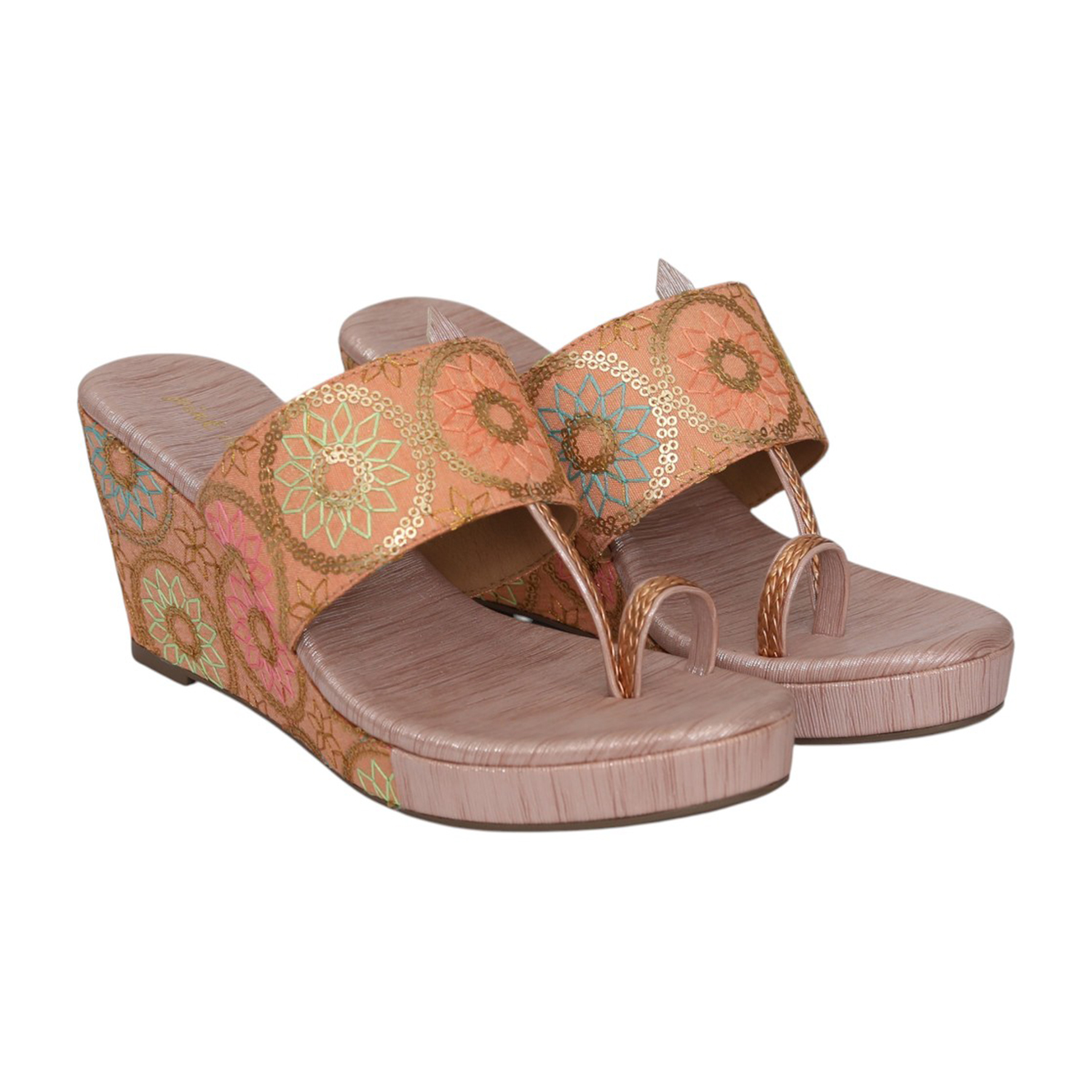 Add a fresh, festive touch to your wardrobe with these elegant wedge sandals. Designed with vibrant floral embroidery on a soft, textured base, this pair beautifully blends tradition with contemporary style. The toe-ring strap offers a secure fit, while the cushioned footbed and lightweight wedge heel ensure lasting comfort. Perfect for celebrations, pairing with ethnic wear.