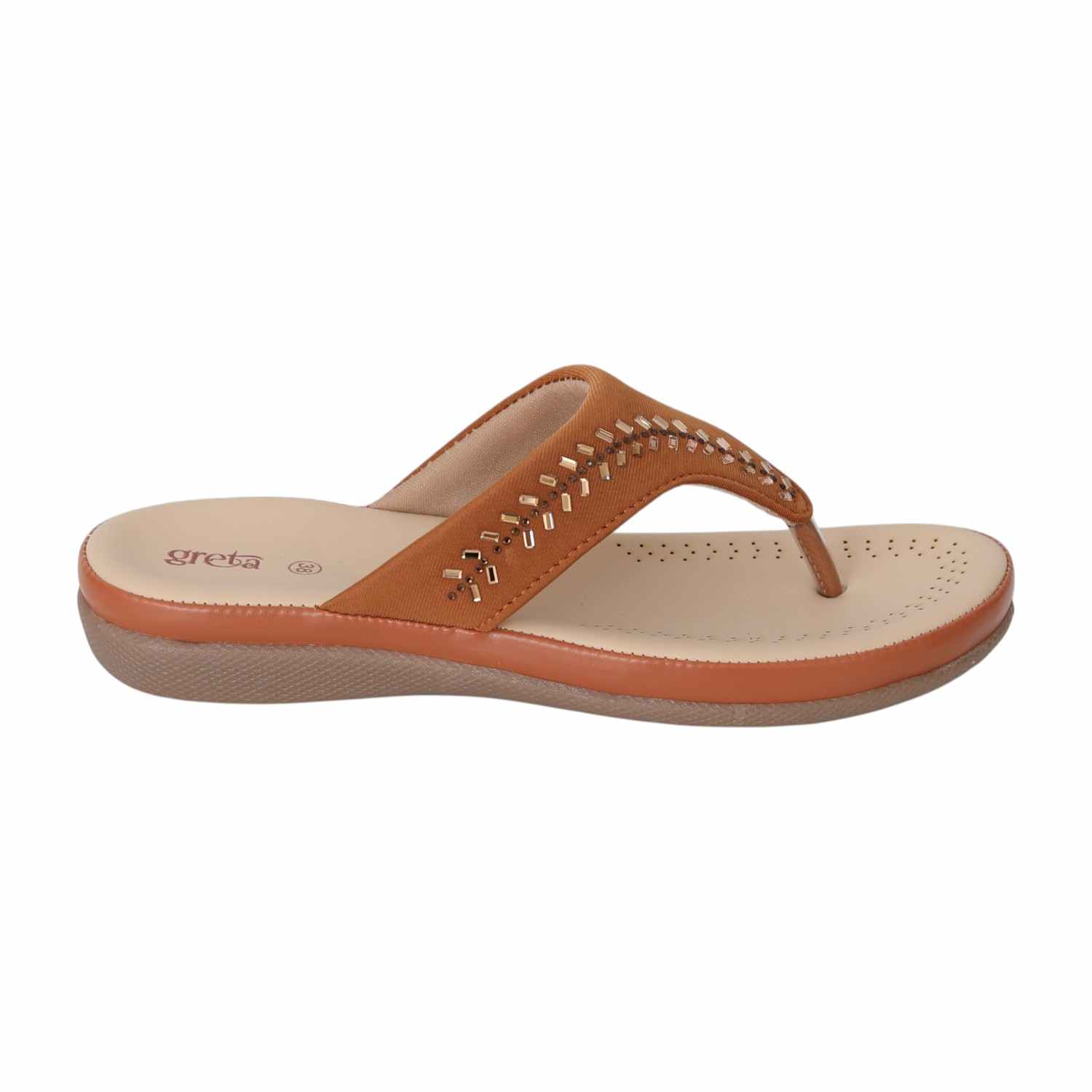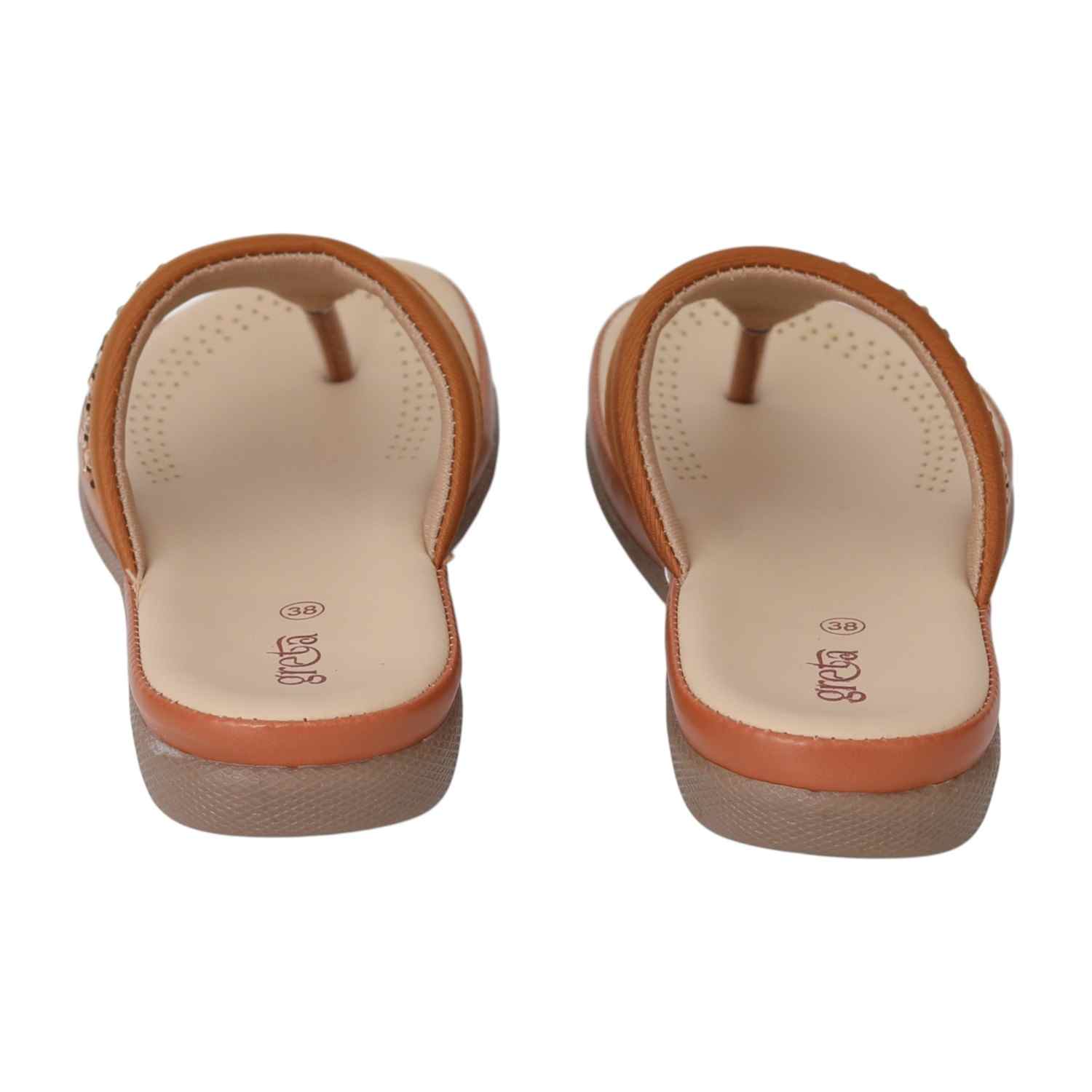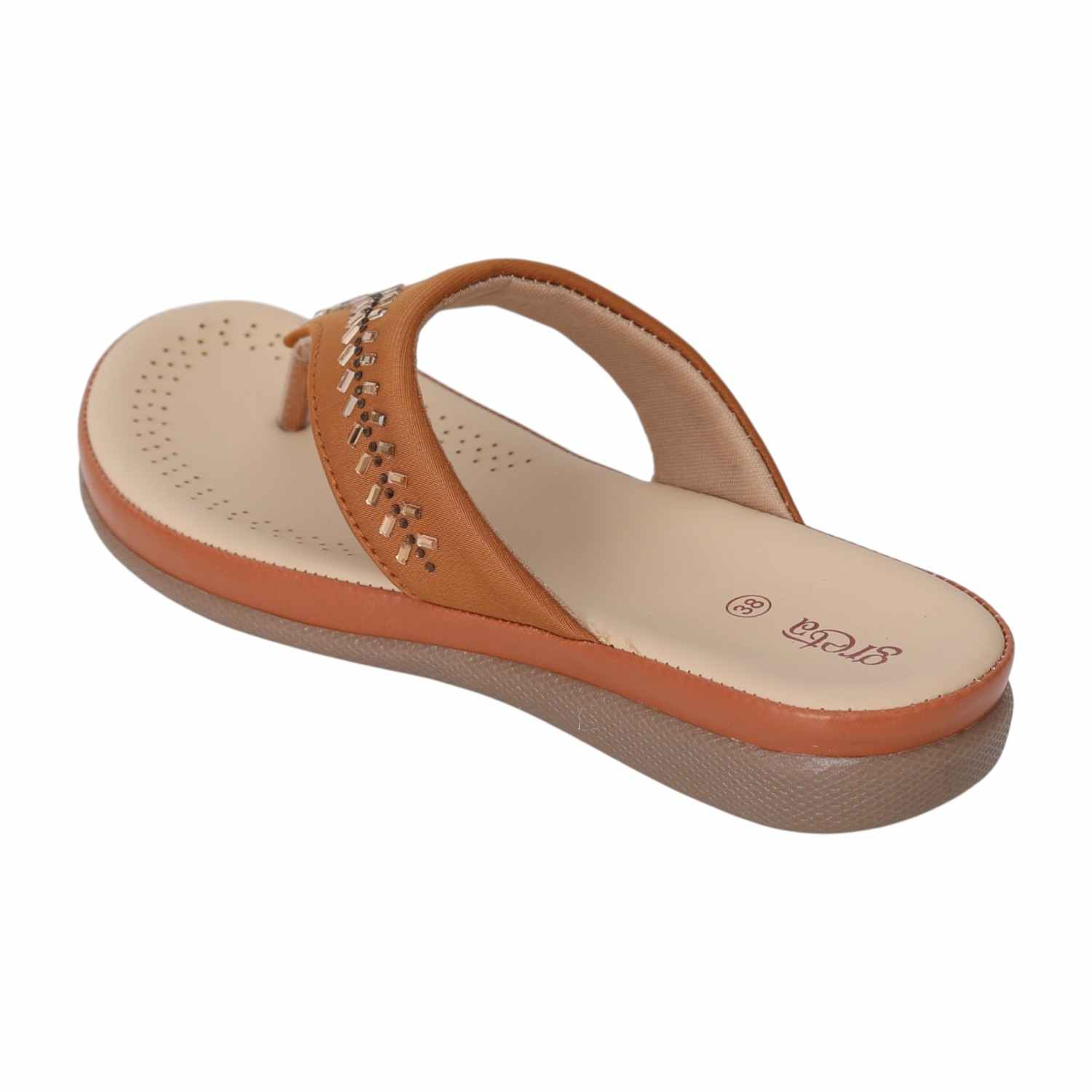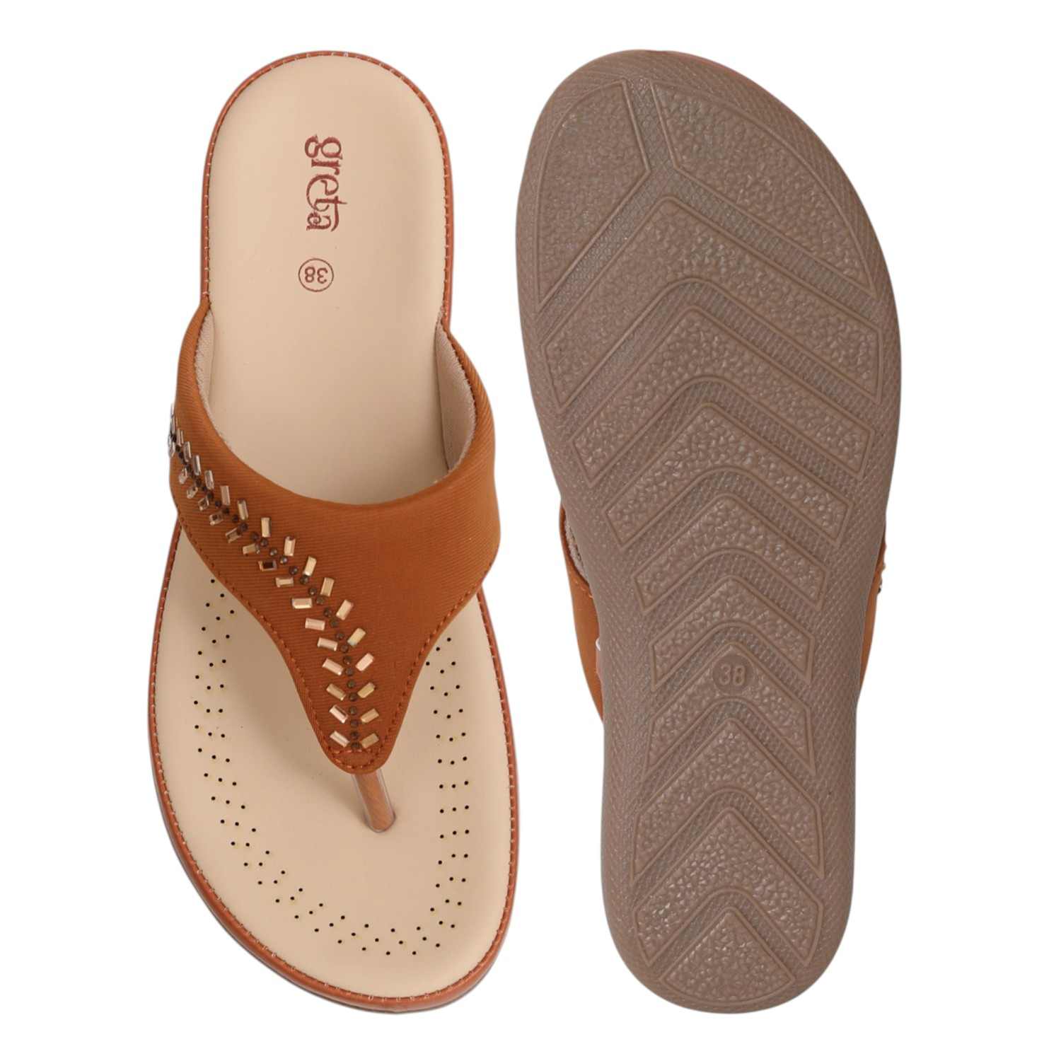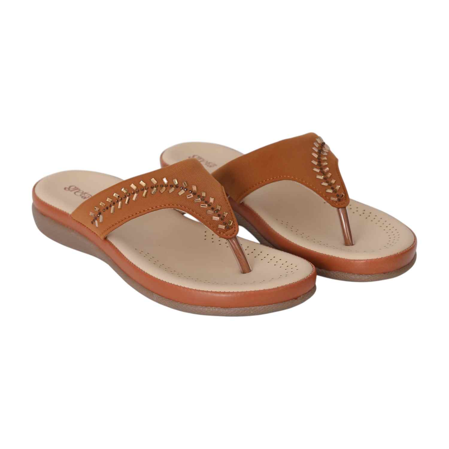 Embrace comfort with a hint of sparkle in the Tan Gleam Comfort Sandals. Crafted with a warm tan upper, this pair features a row of chic gold-toned embellishments that add a refined touch to your everyday look. The beige cushioned footbed is designed for breathability and softness, while the flexible sole ensures a smooth walking experience. Perfect for casual wear, workdays, or quick errands, these sandals are a staple for relaxed, stylish living.