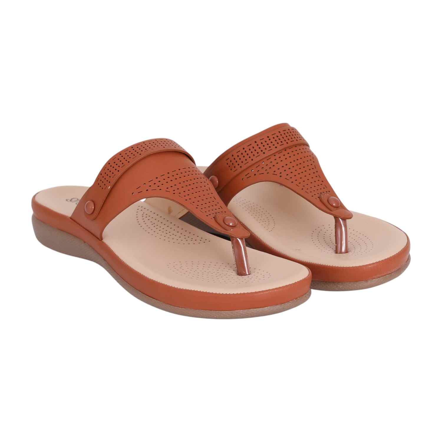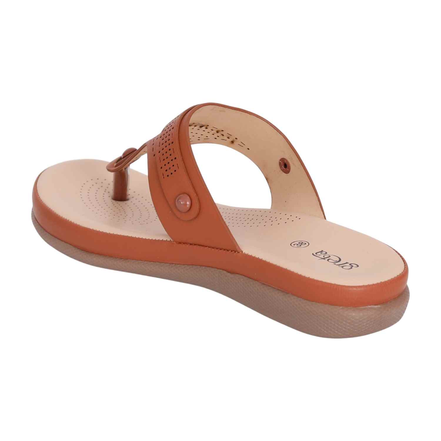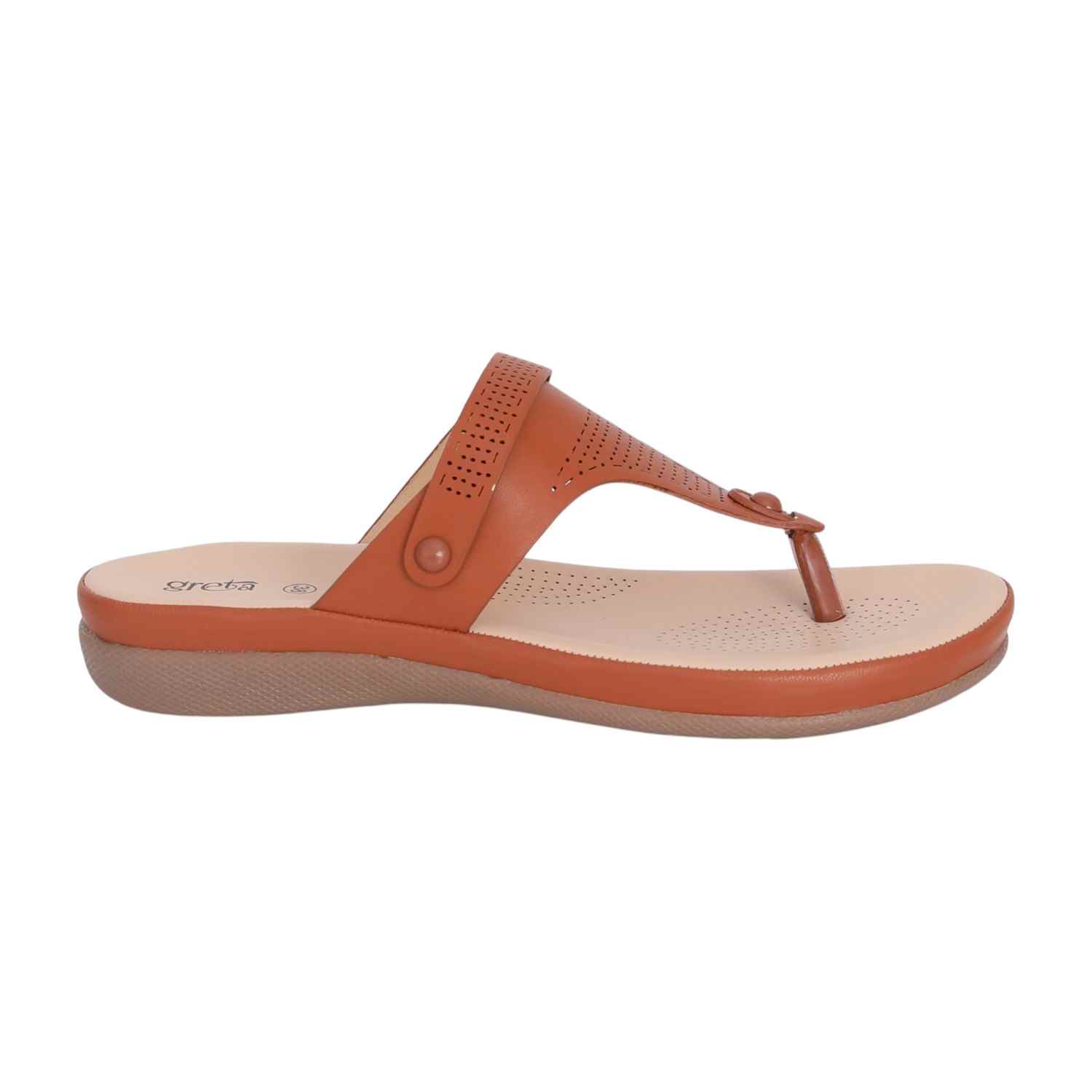 Step into all-day comfort with these stylish sandals designed for effortless wear. Featuring a soft tan strap with fine perforated detailing, they combine breathability with a chic look. The cushioned insole and lightweight sole provide excellent support, making them perfect for casual outings or daily wear.