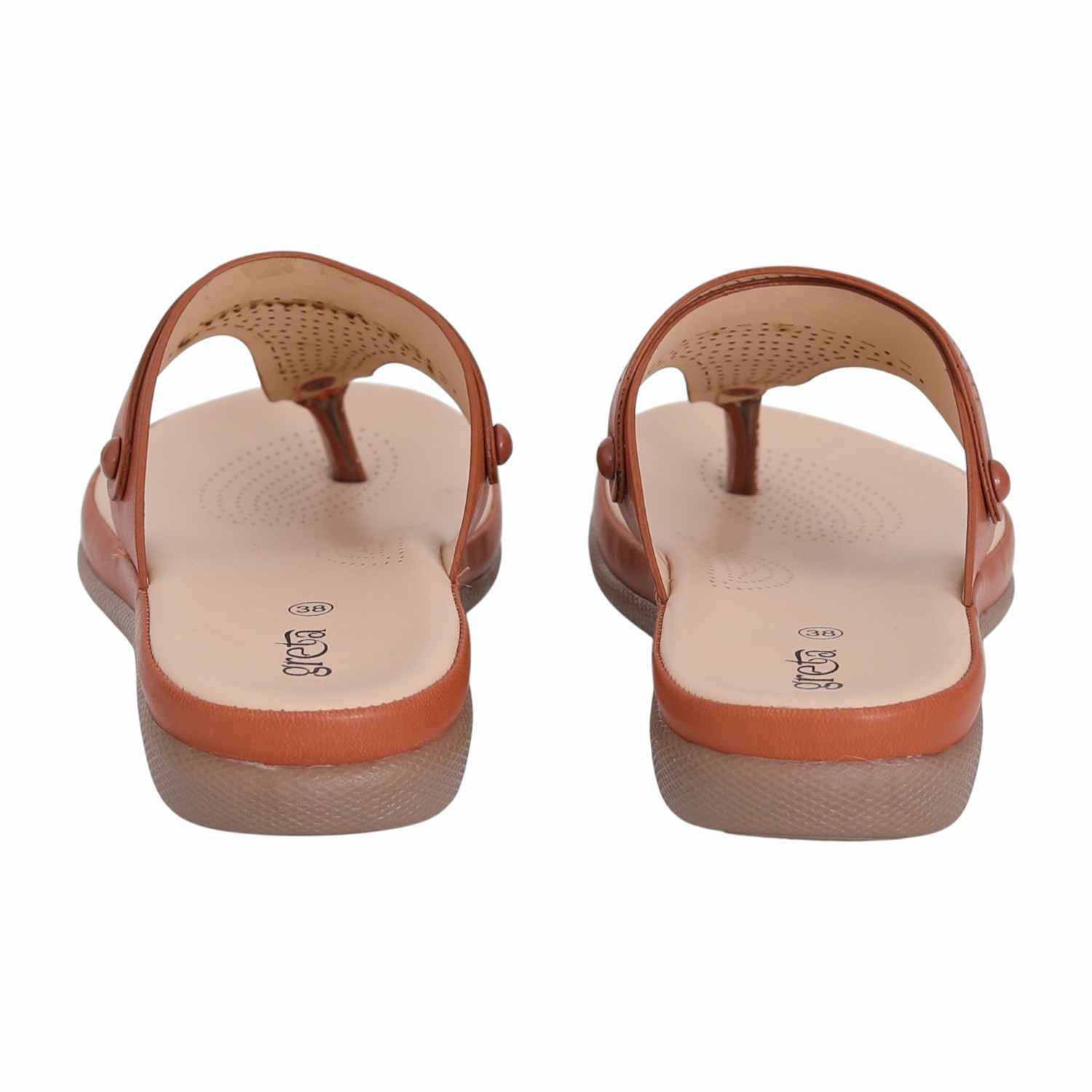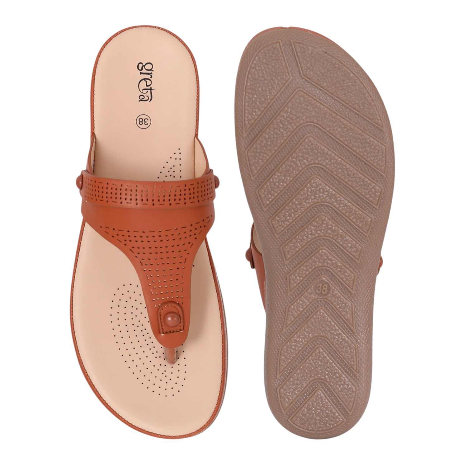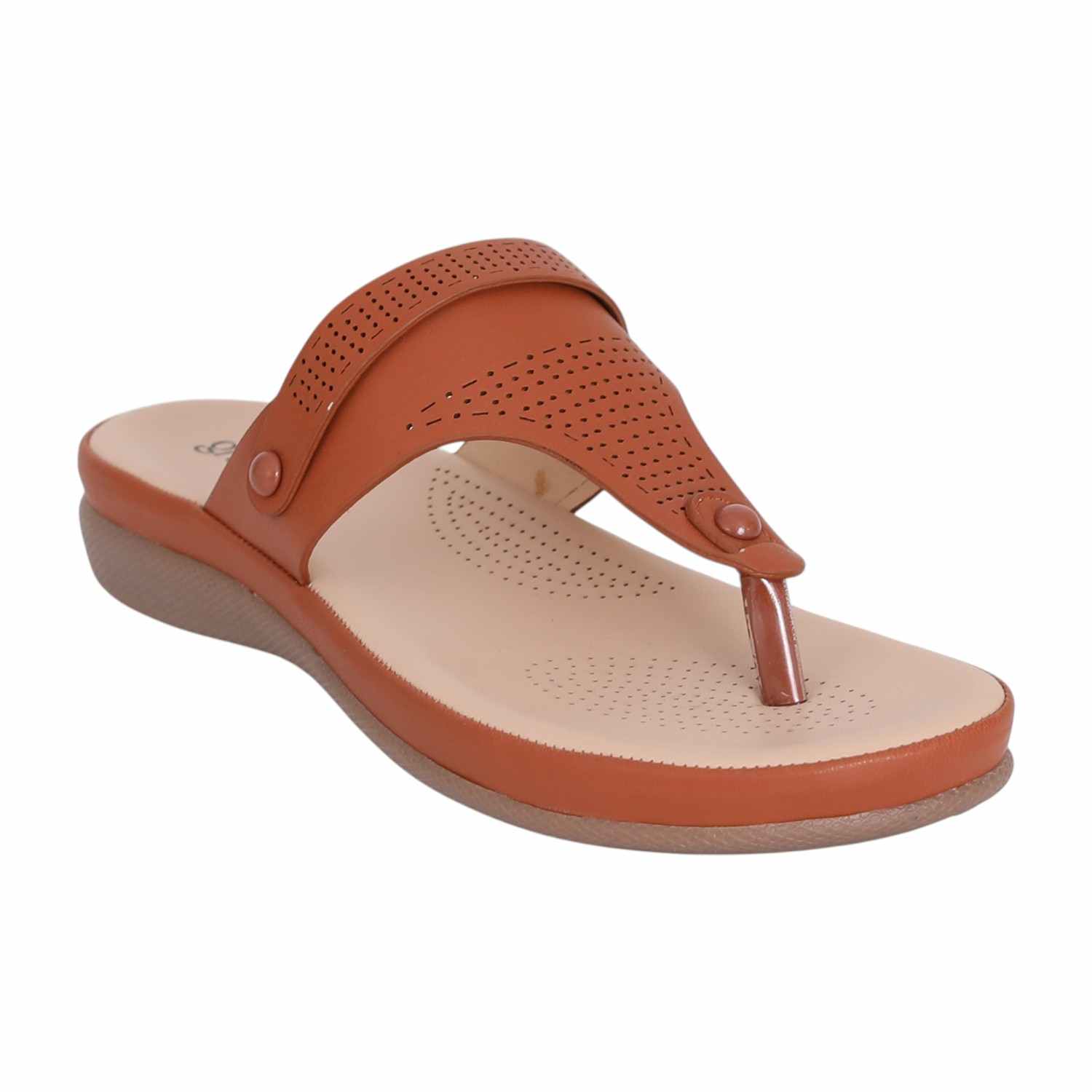 Step into all-day comfort with these stylish sandals designed for effortless wear. Featuring a soft tan strap with fine perforated detailing, they combine breathability with a chic look. The cushioned insole and lightweight sole provide excellent support, making them perfect for casual outings or daily wear.