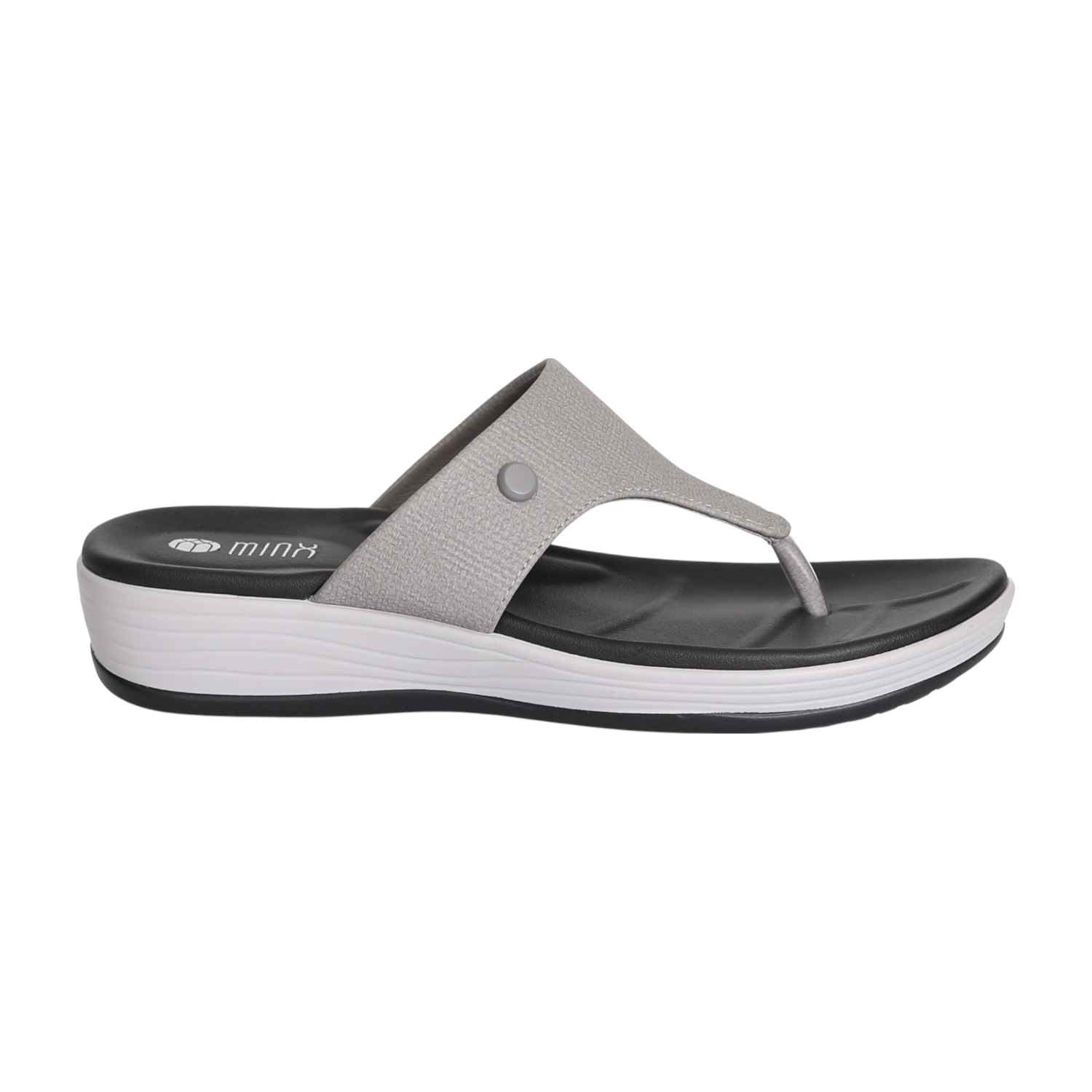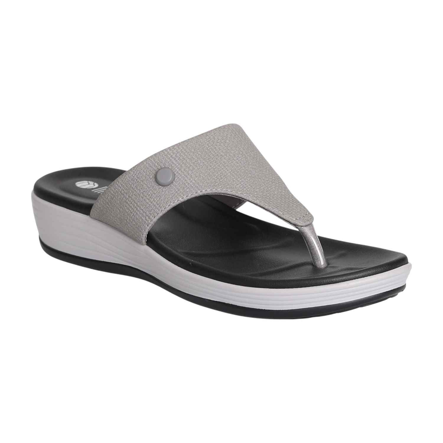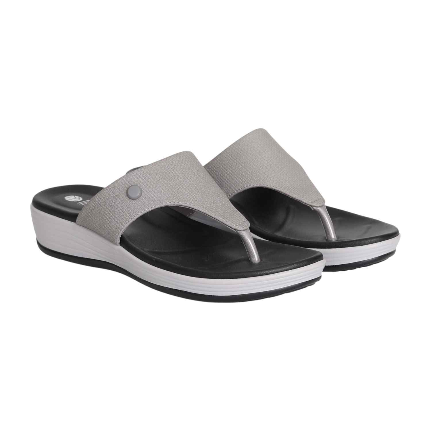 Step into sleek city style with our Urban Grey Wedge Thongs. These modern sandals feature a comfortable black footbed set upon a striking black and white layered wedge sole, offering both visual appeal and supportive lift. The wide, light grey textured strap is accented with a subtle grey button-like detail and meets a metallic silver toe post, creating a sophisticated thong design. Perfect for adding a contemporary edge to your casual ensembles, ensuring both chic style and all-day comfort.