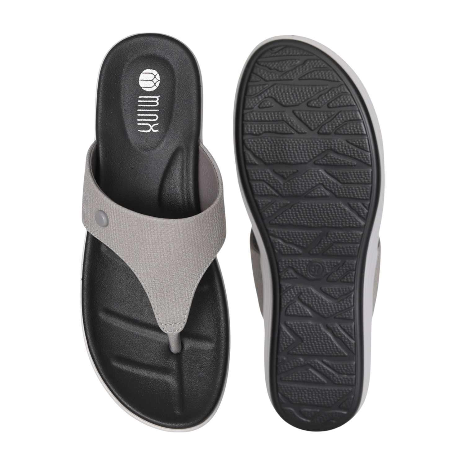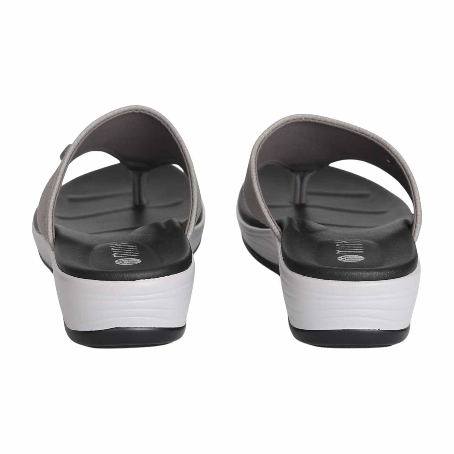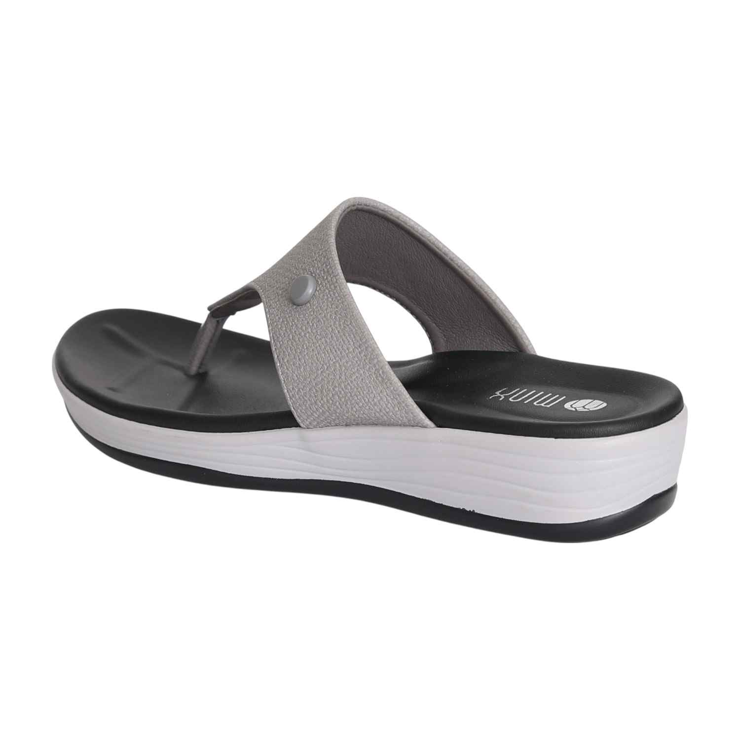 Step into sleek city style with our Urban Grey Wedge Thongs. These modern sandals feature a comfortable black footbed set upon a striking black and white layered wedge sole, offering both visual appeal and supportive lift. The wide, light grey textured strap is accented with a subtle grey button-like detail and meets a metallic silver toe post, creating a sophisticated thong design. Perfect for adding a contemporary edge to your casual ensembles, ensuring both chic style and all-day comfort.