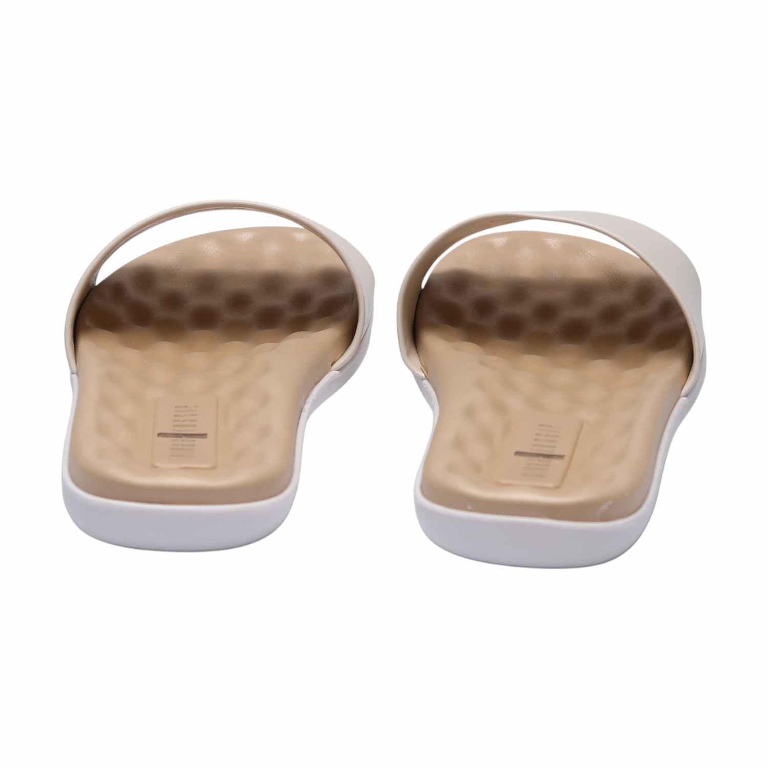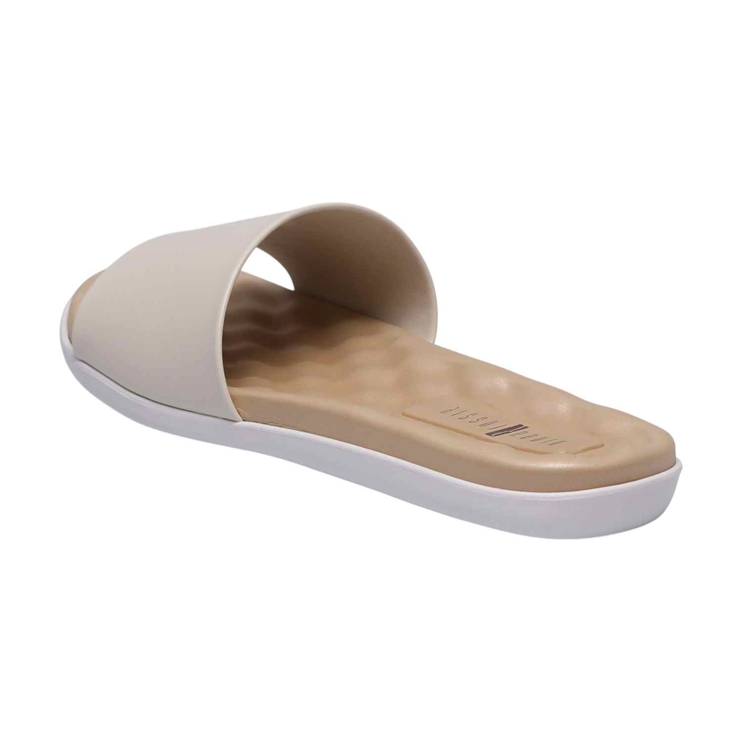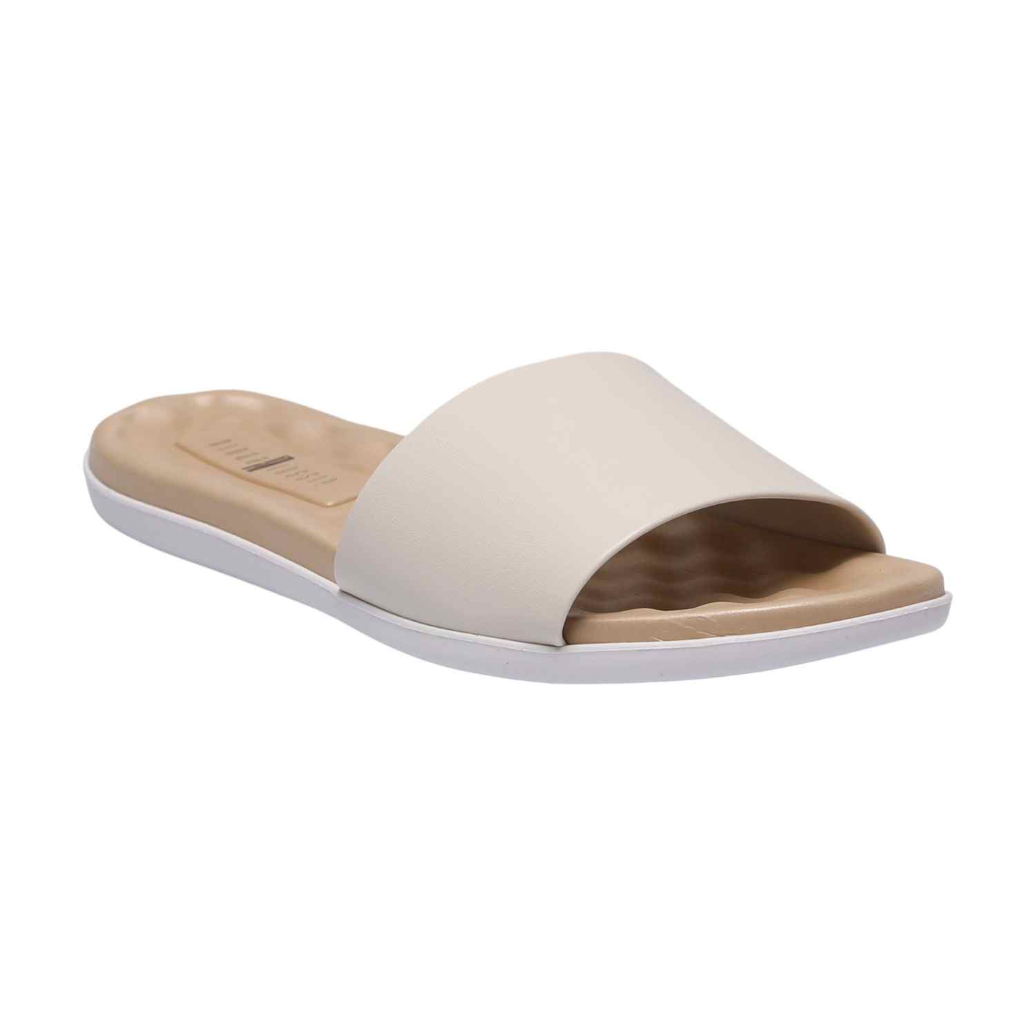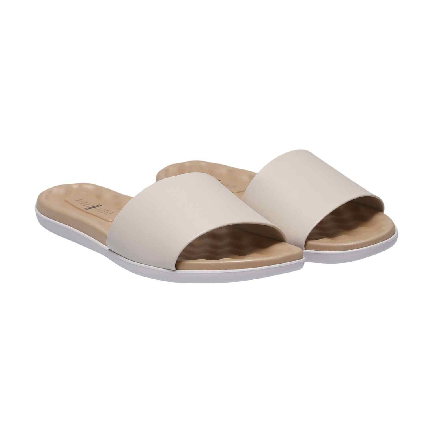 Experience effortless comfort with our Soft Glide White Slides. These minimalist slide sandals feature a wide, smooth White-toned strap that gently embraces your foot. The contoured footbed boasts a subtle wave texture for enhanced comfort, set upon a distinct white midsole layer and a durable outsole, offering a clean, modern look and luxurious all-day wear